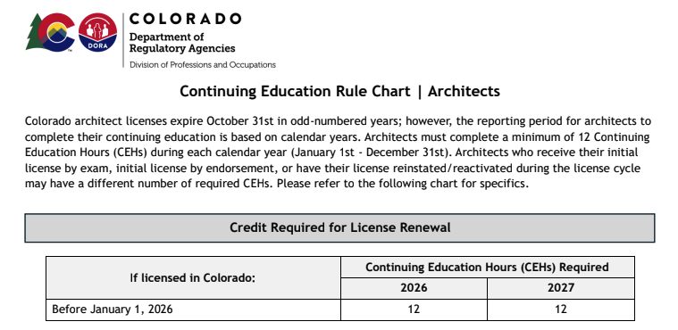 The state of Colorado requires that in order to renew a license, architects need to complete 12 Continuing Education hours every calendar year.