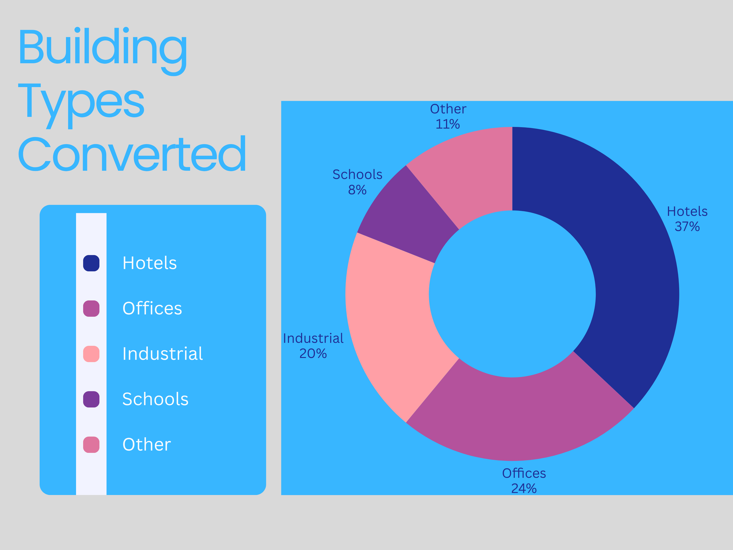 Hotels produced ~37% of converted units, offices about 24%, industrial ~20%, and schools ~8%.