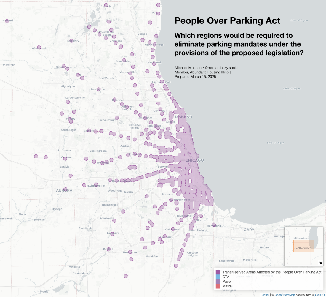 Illinois — People Over Parking Act / SB 2111 (2025 session activity). Illinois’ 2025 transit-oriented parking reforms (commonly referenced as People-Over-Parking provisions) restricted local minimum parking requirements near transit hubs and corridors. Eliminating parking minimums near transit materially lowers per-unit costs and enables smaller, denser multifamily footprints in walkable locations. The reform states that as long as the development is within one-half mile of a public transportation hub, local jurisdictions cannot require parking. Below is a map of Chicago and the surrounding suburbs that are affected by this change.