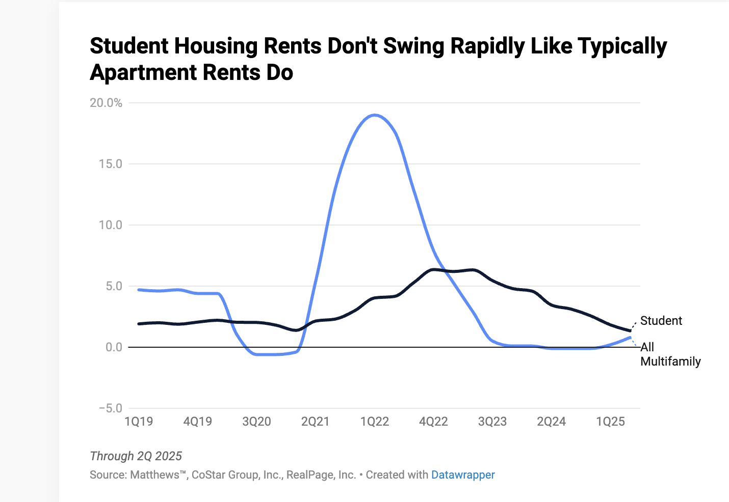 Take a look below at a graph generated by Matthews*, CoStar Group, Inc, RealPage, Inc. expressing the stabilization of student housing rents compared to multifamily overall through the 2nd quarter of 2025.